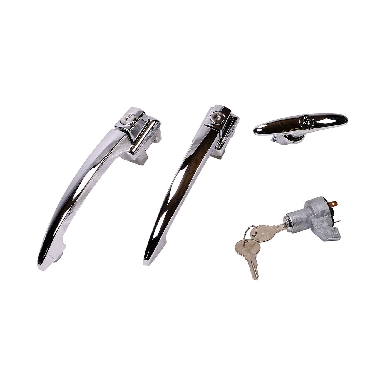 Chrome lock kit for USA Spec Beetle 1964 (chassis 5 888 185+)Includes ignition lock cylinder, engine lid T-handle, door handlesFeatures square push-type buttons and internal Flipper Paddle lock mechanismComes with two random combination keys for securityThis chrome lock kit is designed for the 1964 USA Spec Volkswagen Beetle, from chassis number 5 888 185 onwards. It includes an ignition lock cylinder, engine lid T-handle, and door handles with square push-type buttons, all finished in high-quality chrome. The door locks are equipped with an internal Flipper Paddle style mechanism, allowing the lock to turn 45 degrees to lock and unlock the door handle.Complete with two random combination keys, this kit provides both functionality and style, offering an authentic replacement for your Beetle’s locking system. The durable chrome finish enhances the vehicle’s appearance while ensuring reliable performance.